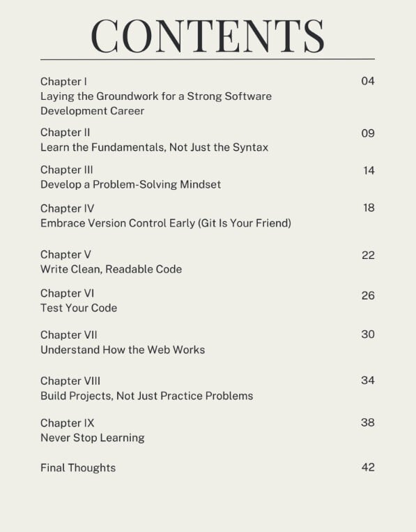 Starting a career in software development can feel overwhelming—new languages to learn, tools to master, and expectations to meet. But just like building a house, a lasting career begins with a solid foundation. The early habits you build, the principles you embrace, and the mindset you cultivate will shape your trajectory for years to come. This EBook lays the groundwork for a strong, resilient, and fulfilling career in software engineering.